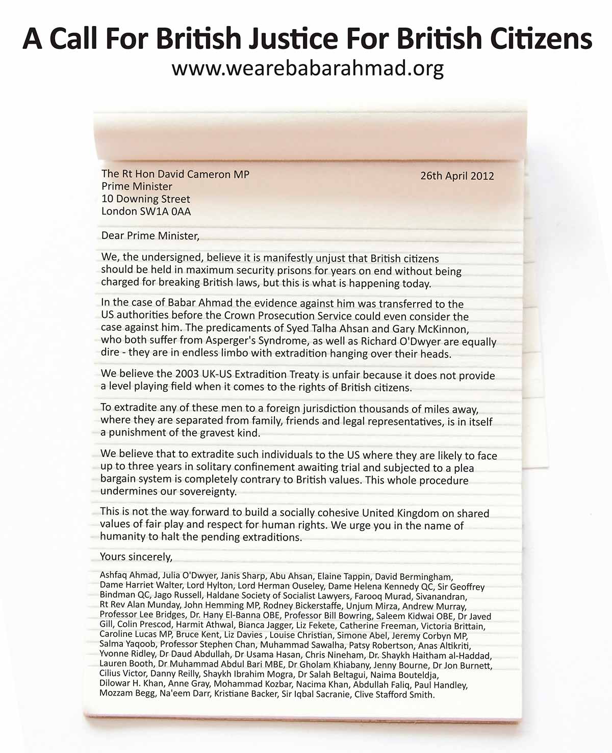 Ashfaq Ahmad (Father of Babar Ahmad), Julia O'Dwyer (Mother of Richard O’Dwyer), Janis Sharp (Mother of Gary McKinnon), Abu Ahsan (Father of Syed Talha Ahsan), Elaine Tappin (Wife of Christopher Tappin), David Bermingham, Dame Harriet Walter, Lord Hylton, Lord Herman Ouseley, Dame Helena Kennedy QC, Sir Geoffrey Bindman QC, Jago Russell (Chief Executive, Fair Trials International), Haldane Society of Socialist Lawyers, Farooq Murad (Secretary General, Muslim Council of Britain), Sivanandran, Rt Rev Alan Munday, John Hemming MP, Rodney Bickerstaffe, Unjum Mirza (Political officer London Transport Region RMT), Andrew Murray (Chief of Staff, Unite), Professor Lee Bridges (Emeritus Professor, University of Warwick, School of Law), Dr. Hany El-Banna OBE, Professor Bill Bowring, Saleem Kidwai OBE (Chair of Muslim Council of Wales), Dr Javed Gill (Convenor, Muslim Council of Scotland), Colin Prescod, Harmit Athwal, Bianca Jagger (Founder and Chair of the Bianca Jagger Human Rights Foundation), Liz Fekete, Catherine Freeman, Victoria Brittain, Caroline Lucas MP, Bruce Kent, Liz Davies (Barrister), Louise Christian (Christian Khan Solicitors), Simone Abel (Director Rene Cassin), Jeremy Corbyn MP, Salma Yaqoob (Respect Party), Professor Stephen Chan, Muhammad Sawaiha (President, British Muslim Initative), Patsy Robertson, Anas Altikriti (CEO, The Cordoba Foundation), Yvonne Ridley, Dr Daud Abdullah, Dr Usama Hasan (Middlesex University), Chris Nineham (Stop the War Coalition), Dr. Shaykh Haitham al-Haddad, Lauren Booth, Dr Muhammad Abdul Bari MBE (Former Secretary General, Muslim Council of Britain), Dr Gholam Khiabany, Jenny Bourne, Dr Jon Burnett, Cilius Victor, Danny Reilly, Shaykh Ibrahim Mogra, Dr Salah Beltagui (East Kilbride Muslim Community), Naima Bouteldja (Journalist), Dilowar H. Khan (President, Islamic Forum of Europe), Anne Gray (Campaign Against Criminalising Communities), Mohammad Kozbar (Chair, Lebanese Muslim League), Nacima Khan (Muslimaat UK), Abdullah Faliq (Chair, Enough Coalition Against Islamophobia), Paul Handley, Mozzam Begg (Director, Cageprisoners), Na'eem Darr (CEO, Muslim Directory UK), Kristiane Backer (Broadcaster/Journalist), Sir Iqbal Sacranie, Clive Stafford Smith.