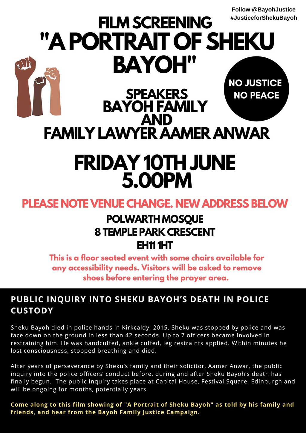 Come along to this film showing of "A portrait of Sheku" as told by his family and friends, and hear from the Bayoh Family Justice Campaign.